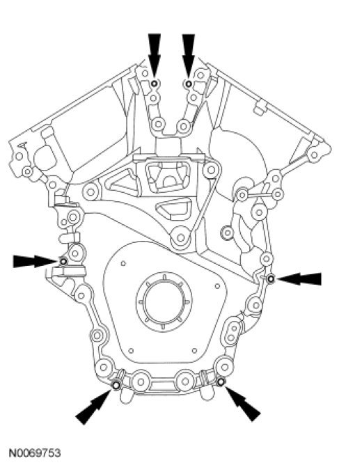 2. NOTICE: Place clean, lint free shop towels over exposed engine cavities. Carefully remove the towels so foreign material is not dropped into the engine. Any foreign material (including any material created while cleaning gasket surfaces) that enters the oil passages or the oil pan, may cause engine failure.