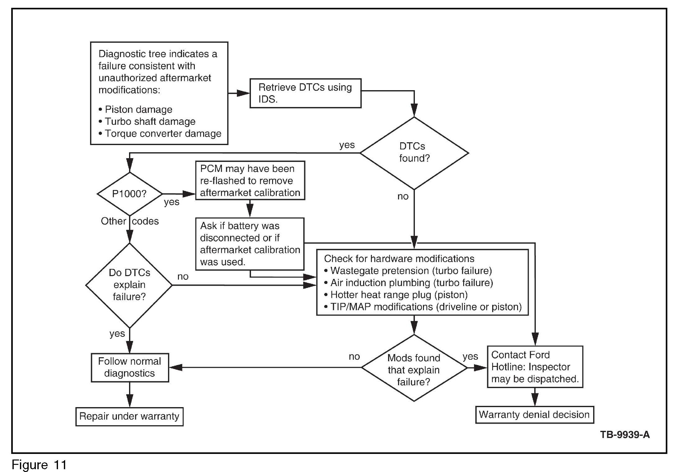 Unauthorized calibration modifications may or may not be detectable using standard tools (Integrated Diagnostic System (IDS), Portable Diagnostic Software (PDS), NGS+ VCM). Changes can be made to the calibration and flashed to the PCM through the OBD port. Physical modifications to the hardware may or may not be present. If aftermarket power/torque-increasing modifications are suspected, care should be taken to record and store the following items: Permanent Diagnostic Trouble Codes (DTCs), Pending DTCs, Freeze Frame Data, Mode 6 and Mode 9 data. The data should be printed and attached to the repair order for later reference.