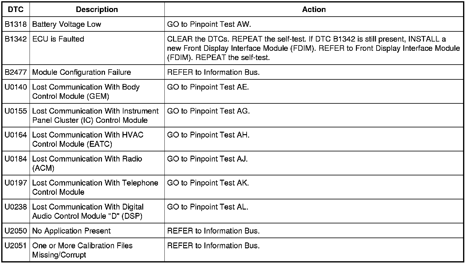 Front Display Interface Module (FDIM) DTC Chart - Without Navigation