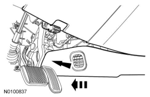 - Push the floor console LH lower trim panel toward the front of the vehicle to detach the trim panel from the pin-type retainer.