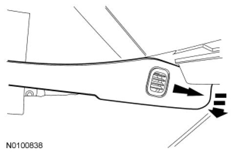 2. Pull the floor console finish mouldings toward the rear of the vehicle to release the retaining clips from the center instrument finish panel.