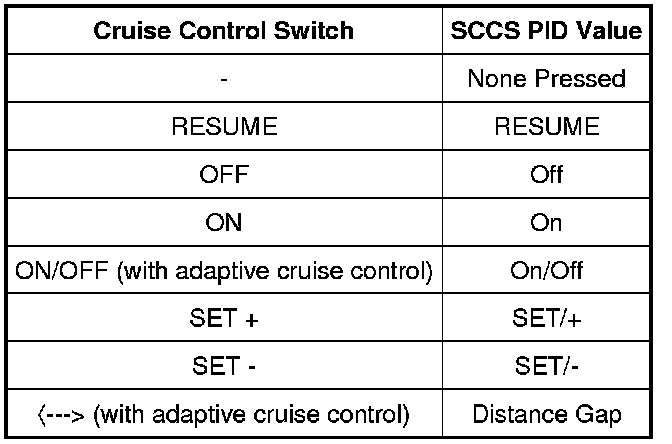 - Press each cruise control switch button while monitoring the SCCS PID (cruise control switch).