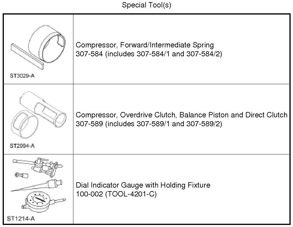 7. Remove the Overdrive Clutch, Balance Piston and Direct Clutch Compressor Set 307-589/1 and the Forward/Intermediate Spring Compressor 307-584/2.