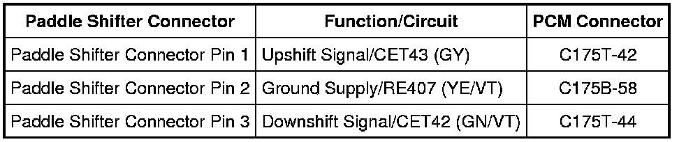- For vehicles equipped with a 3.5L engine, measure the resistance between the paddle shifter connector, harness side and the PCM C175B and C175T, harness side using the following chart: