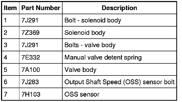 6. NOTICE: Make sure not to pinch the Turbine Shaft Speed (TSS), Output Shaft Speed (OSS) or Transmission Range (TR) sensor wiring harnesses when installing the solenoid body. Damage to the wiring harness will occur.