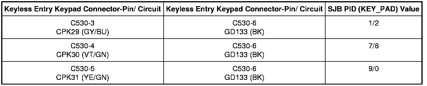 - For late build vehicles, connect a fused jumper wire between the keyless entry keypad, harness side, while monitoring the SJB PID (KEY_PAD) as follows: