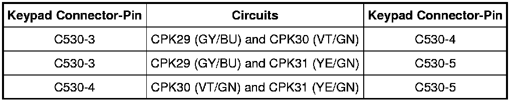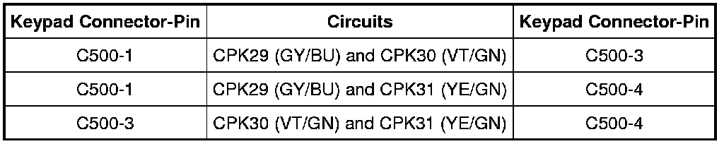- For early build vehicles, measure the resistance between the keypad, harness side as follows: