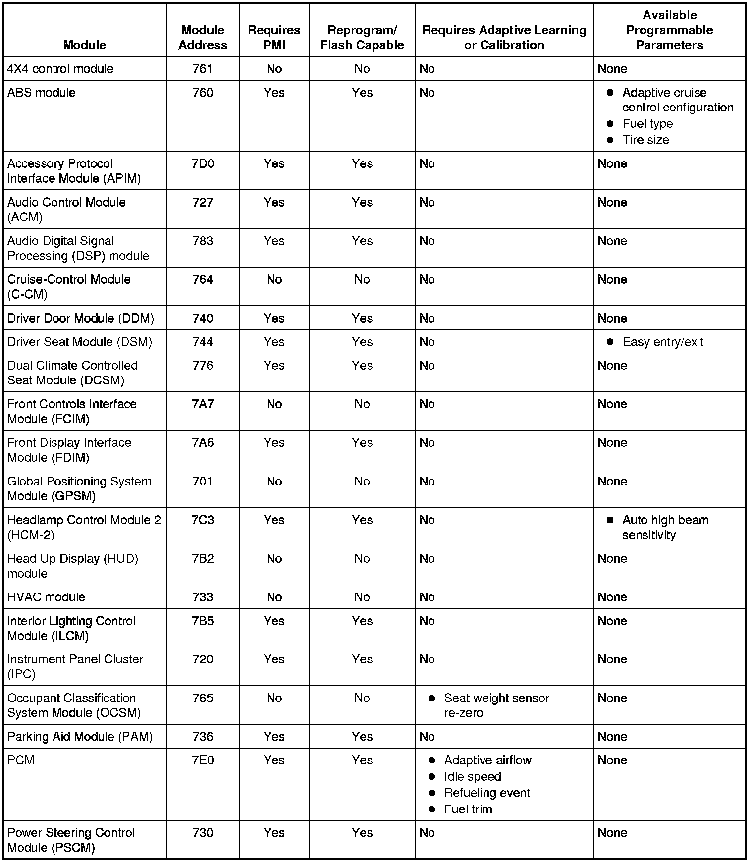 PMI is a scan tool process which configures settings in a new module. Data used for the PMI process is automatically downloaded from the original module and stored when a scan tool session is started. If this data cannot be retrieved from the module being replaced, the scan tool may prompt for As-Built data entry or display a list of parameter values that need to be manually selected. Some modules are reprogrammed during PMI when a strategy/calibration update is available. To carry out PMI , refer to Programmable Module Installation (PMI) Programmable Module Installation (PMI).