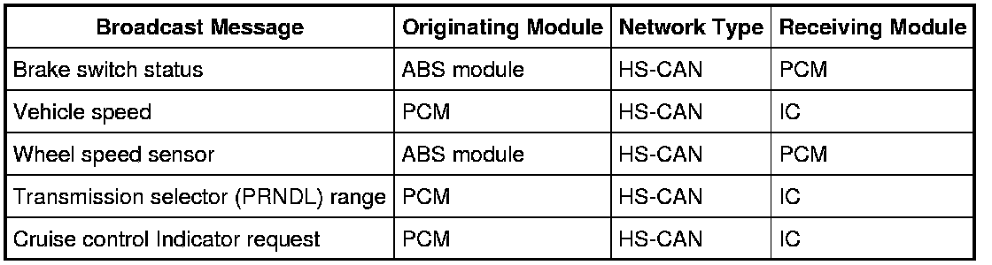 While there are numerous messages internal to the cruise control system modules, the following messages are utilized by the cruise control system in conjunction with outside systems: