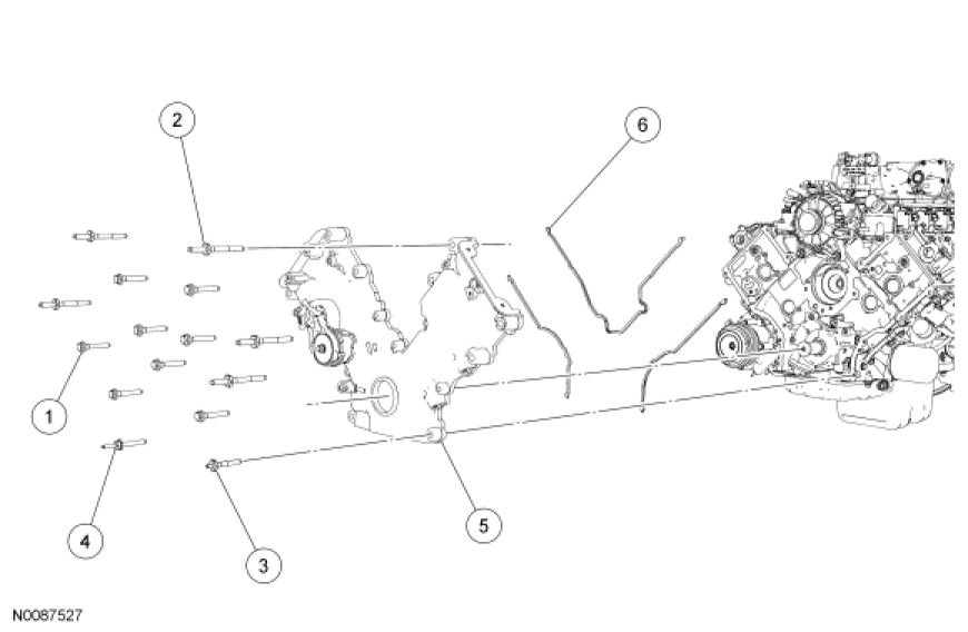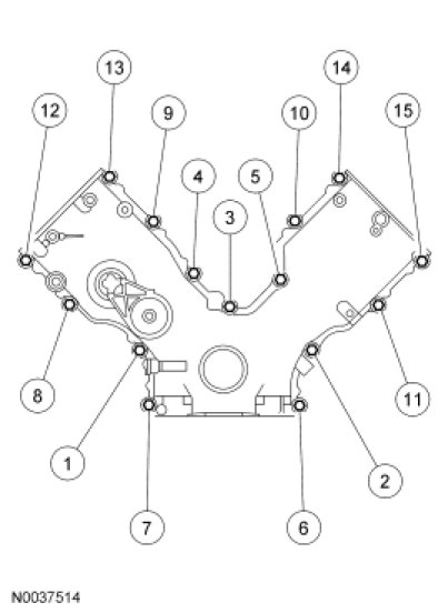 4. Tighten the front cover fasteners in the sequence shown to 25 Nm (18 lb-ft).