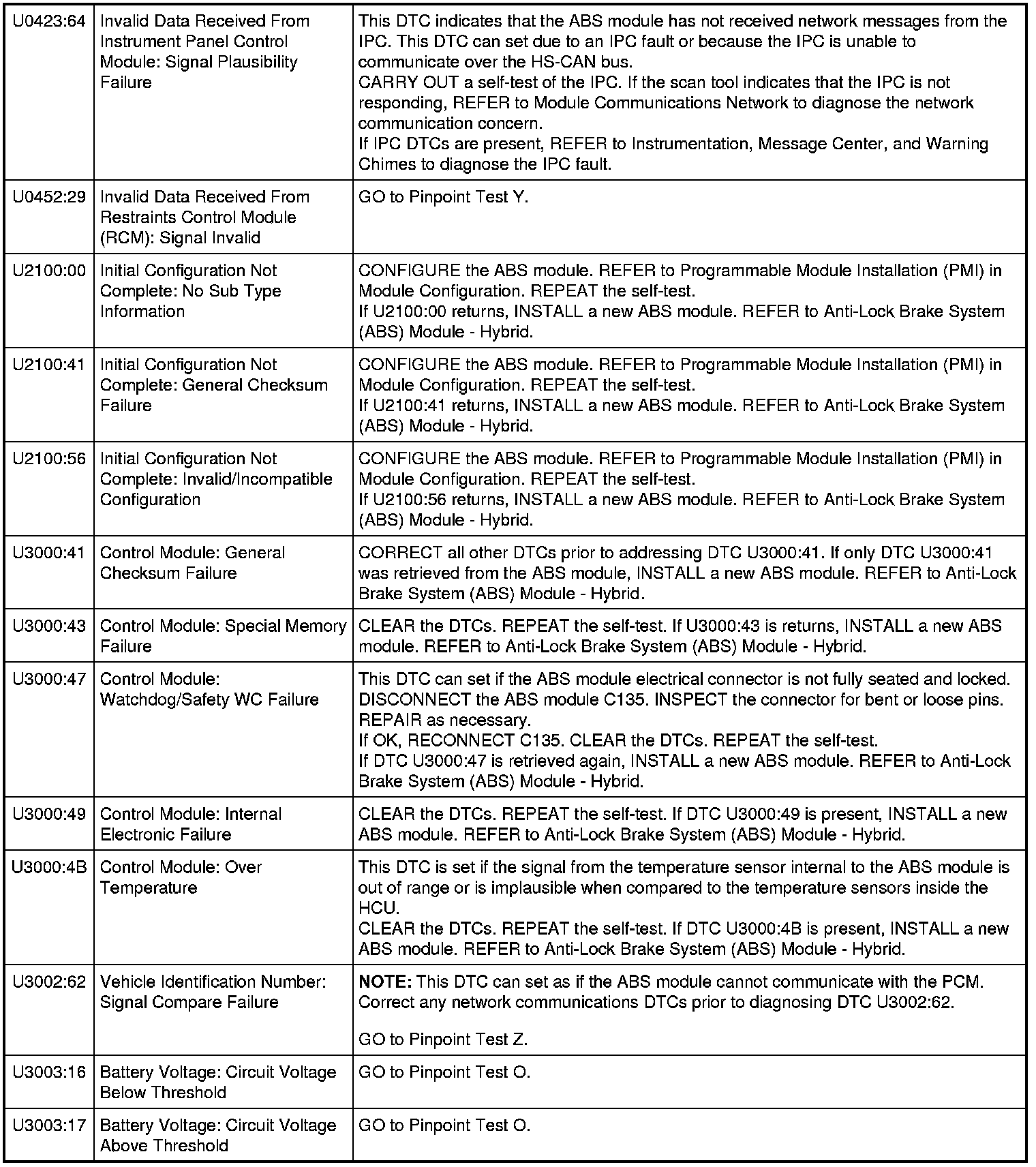 NOTE: This DTC chart applies to hybrid vehicles only. For non-hybrid vehicle DTCs, refer to the ABS Module DTC Chart in Anti-Lock Control - Non-Hybrid.