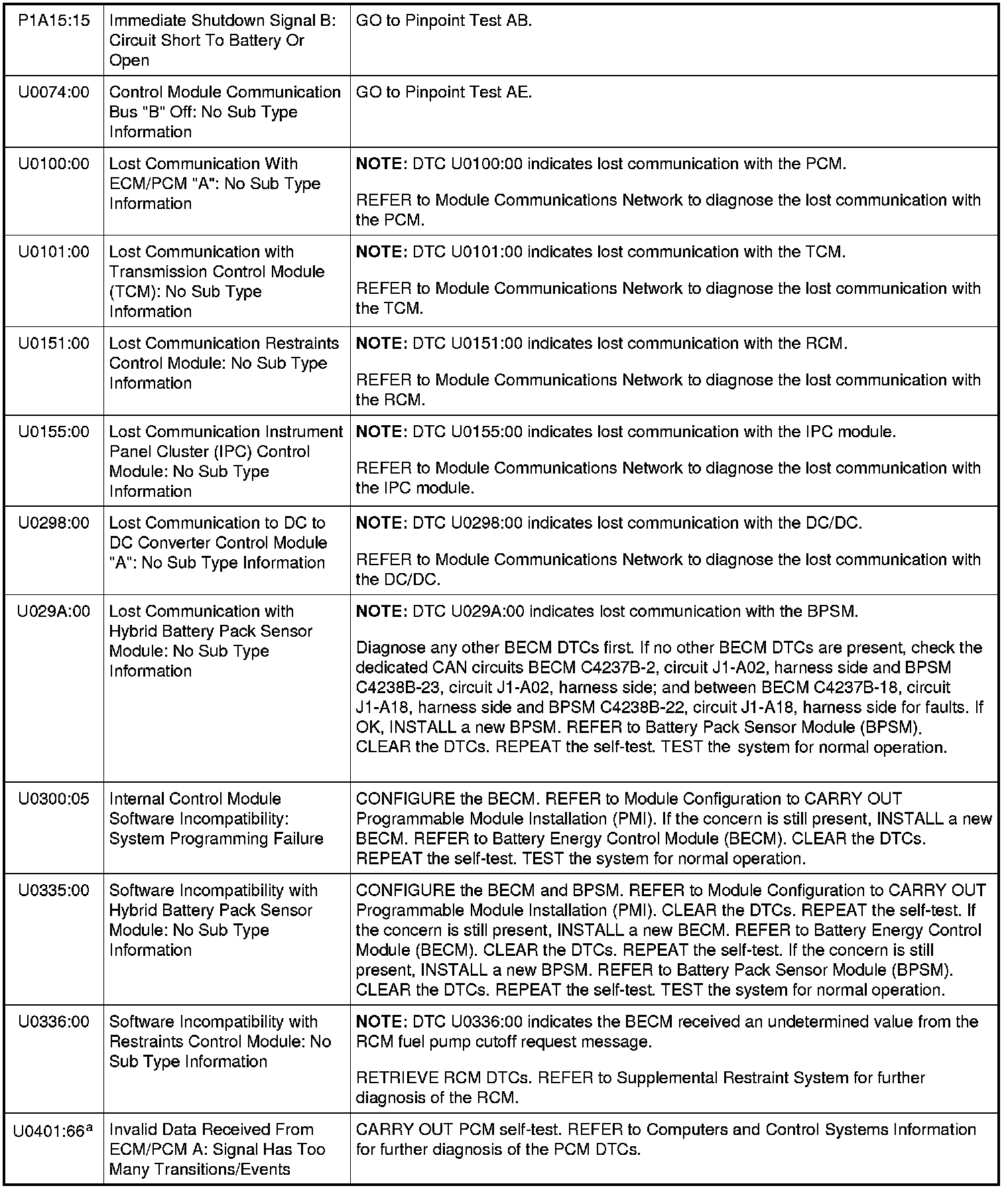 NOTE: Network DTCs (U-codes) are often a result of intermittent concerns such as damaged wiring or low battery voltage occurrences. Additionally, vehicle service procedures such as module reprogramming often set network DTCs. Replacing a module to resolve a network DTC is unlikely to resolve the concern. To prevent repeat network DTC concerns, inspect all network wiring, especially connectors. Test the vehicle battery condition, refer to Battery, Mounting and Cables Testing and Inspection.