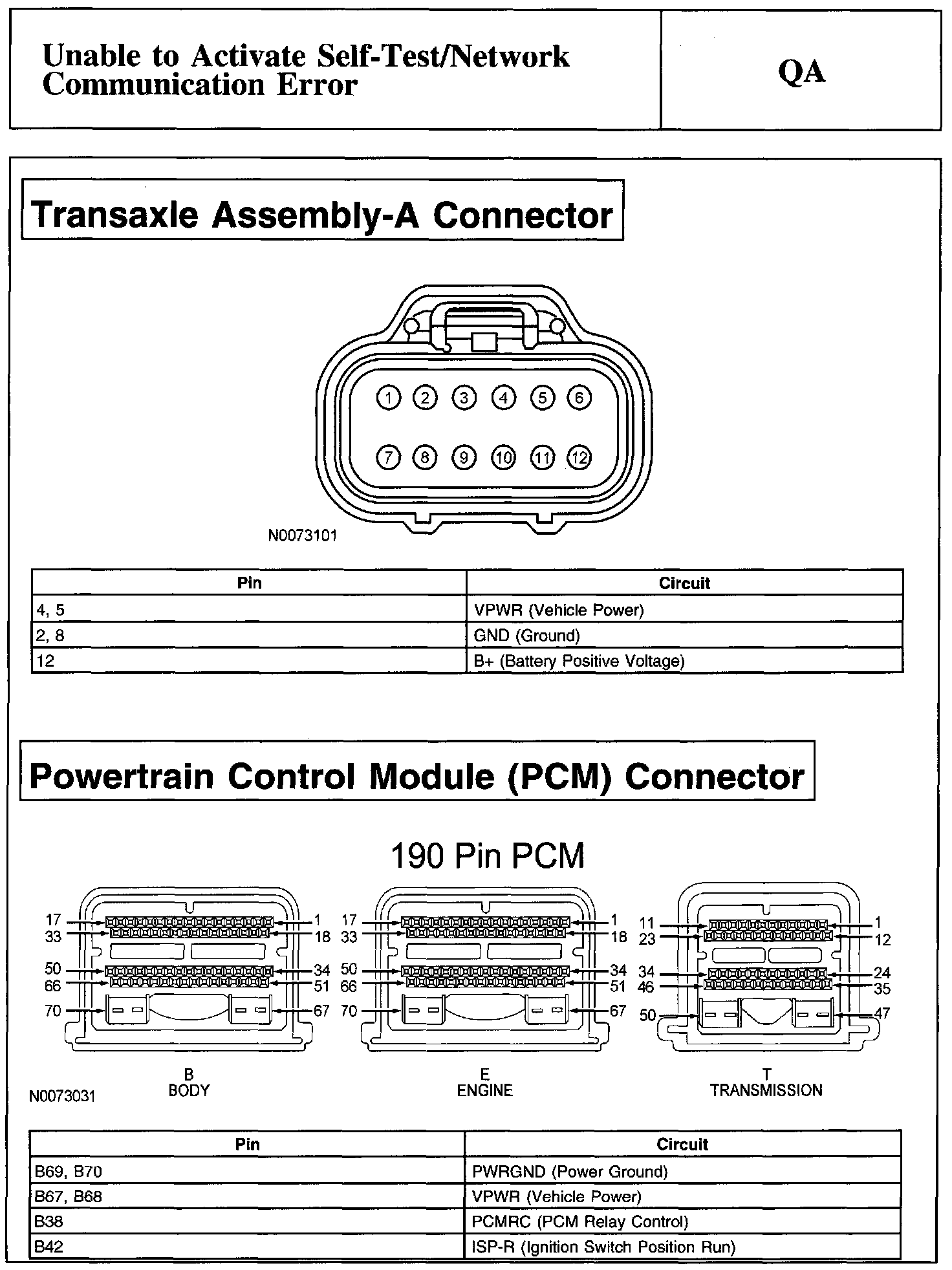 PINPOINT TEST QA: UNABLE TO ACTIVATE SELF-TEST/NETWORK COMMUNICATION ERRORWarning And Electronic Throttle Body (ETB) Connector: