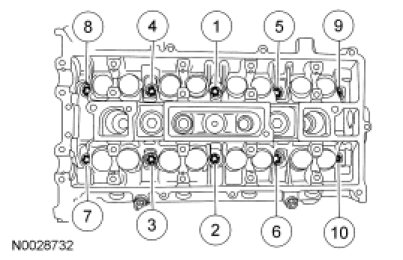 Install the camshafts and bearing caps in their original location and orientation. Tighten the bearing caps in the sequence shown in 3 stages: