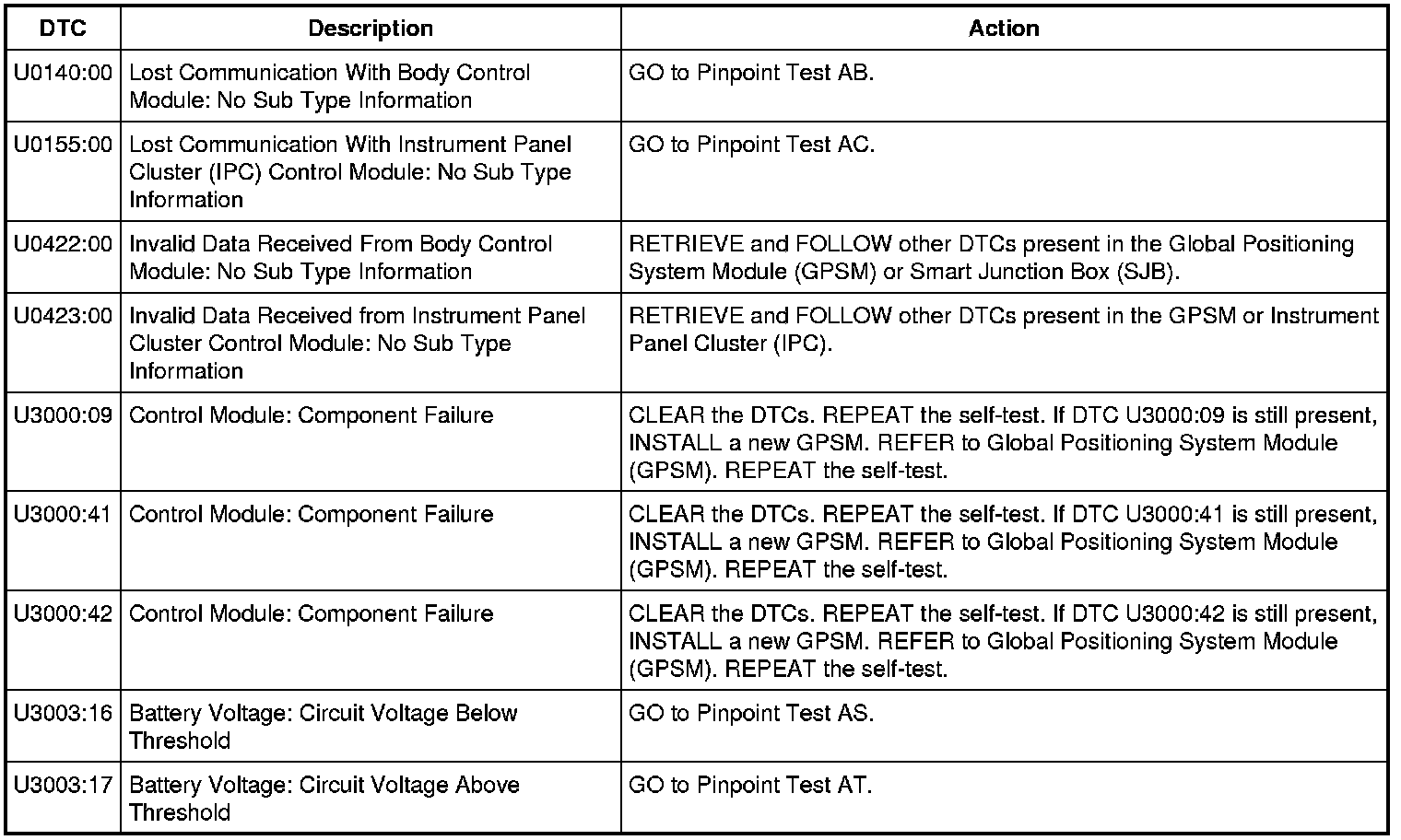 Global Positioning System Module (GPSM) DTC Chart