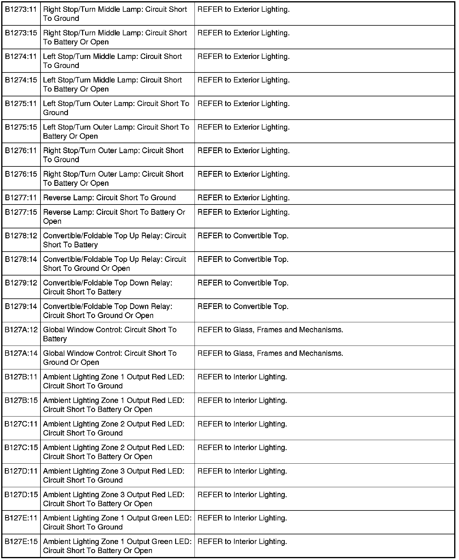 NOTE: This module utilizes a 5-character DTC followed by a 2-character failure-type code. The failure-type code provides information about specific fault conditions such as opens, or shorts to ground. Continuous memory DTCs have an additional 2-character DTC status code suffix to assist in determining DTC history.
