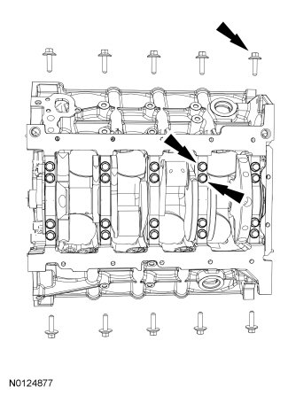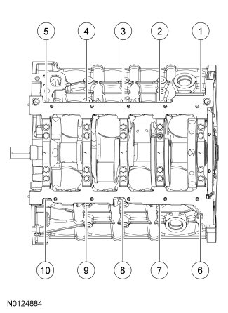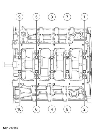 12. Tighten the 10 new outside vertical main bearing cap fasteners in the sequence shown, in 3 stages.