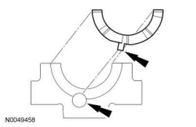 Install the lower crankshaft thrust washer to the back side of the No. 5 main bearing cap, with the tab aligned with the cutout in the main bearing cap.