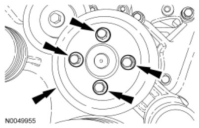 112. Install the coolant pump pulley and install the 4 bolts hand-tight.