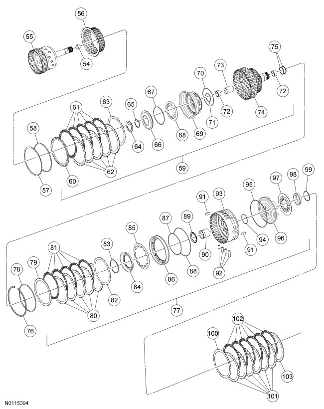 25. Install the low/reverse clutch plates, starting with the pressure plate and alternating between the friction and steel plates and ending with the wave spring plate on the top.