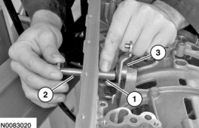 12. Assemble the Front Wheel Hub Oil Seal Installer and the Rear Bearing 4X2 Installer on the Drawbar and install the bearing in the transmission case.
