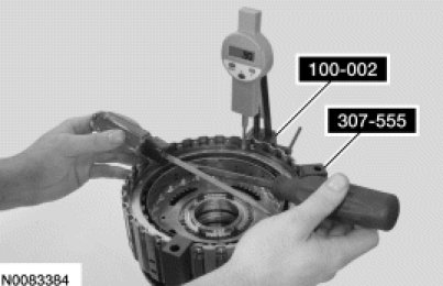 Install the forward clutch assembly into the Clutch End Play Gauge and install the Dial Indicator Gauge with Holding Fixture and position the plunger so it fits into the opening of the snap ring.