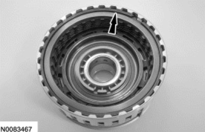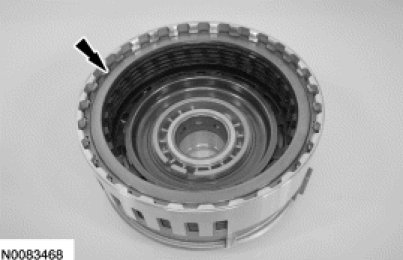 7. Install the new intermediate clutch plates, starting with the wave spring then a steel plate and alternating between friction and steel plates, and ending with the pressure plate.