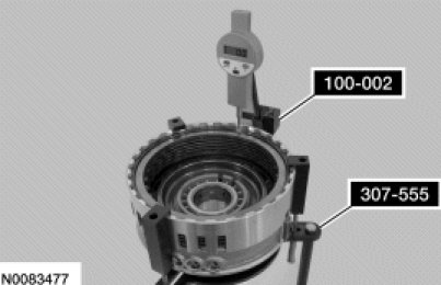 Install the intermediate clutch assembly into the Clutch End Play Gauge and install the Dial Indicator Gauge with Holding Fixture and position the plunger so it fits into the opening of the snap ring.