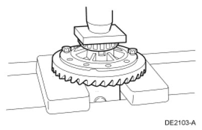 16. Position the differential ring gear and the differential case. Align the bolt holes by starting 2 new bolts through the holes in the differential case and the differential ring gear. Press the differential ring gear on the differential case.