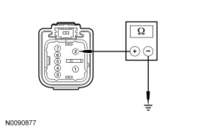 - Measure the resistance between RH front window motor C623-5, circuit CPW12 (GN/OG), harness side and RH front window control switch C604-3, circuit CPW12 (GN/OG), harness side.