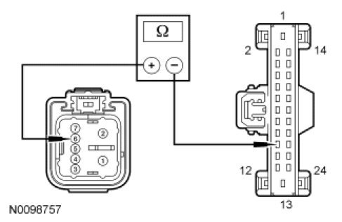- Measure the resistance between RH front window motor C623-6, circuit CPW73 (GN/VT), harness side and BCM-B C4368A-22, circuit CPW73 (GN/VT), harness side.
