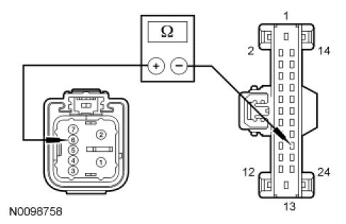 - Measure the resistance between LH front window motor C3119-6, circuit CPW73 (GN/VT), harness side and BCM-B C4368A-22, circuit CPW73 (GN/VT), harness side.