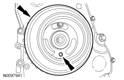 NOTICE: Do not loosen or remove the crankshaft pulley bolt without first installing the special tools as instructed in this procedure. The crankshaft pulley and the crankshaft timing sprocket are not keyed to the crankshaft. The crankshaft, the crankshaft sprocket and the pulley are fitted together by friction, using diamond washers between the flange faces on each part. For that reason, the crankshaft sprocket is also unfastened if the pulley bolt is loosened. Before any repair requiring loosening or removal of the crankshaft pulley bolt, the crankshaft and camshafts must be locked in place by the special service tools or severe engine damage can occur.