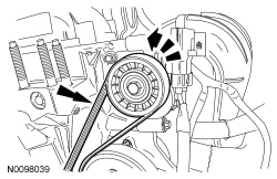 131. Rotate the accessory drive belt tensioner counterclockwise and install the accessory drive belt.