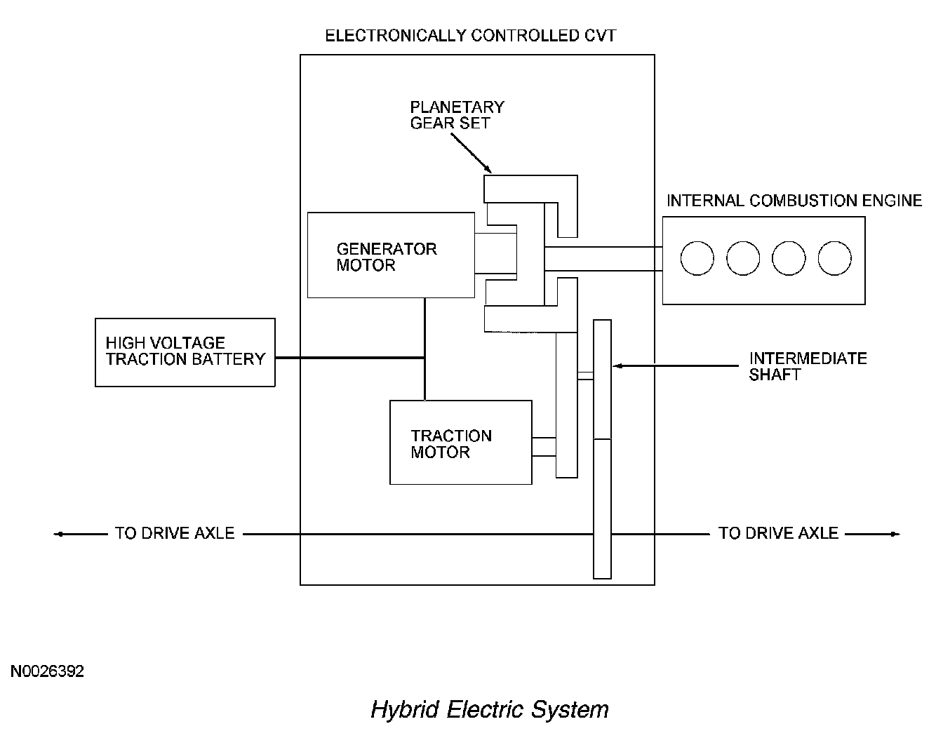 The primary objective of the electronically controlled CVT is to deliver torque to the drive axles of the vehicle. The CVT transmits input torque from the internal combustion engine, or uses electrical power from the high voltage traction battery. The electrical power is converted into mechanical power by the traction motor and the generator motor. The electronically controlled CVT operates in several different modes, and under certain conditions can transmit power from the traction motor and engine simultaneously or independently. For additional information, refer to Hybrid Electric Control Software, operating modes.