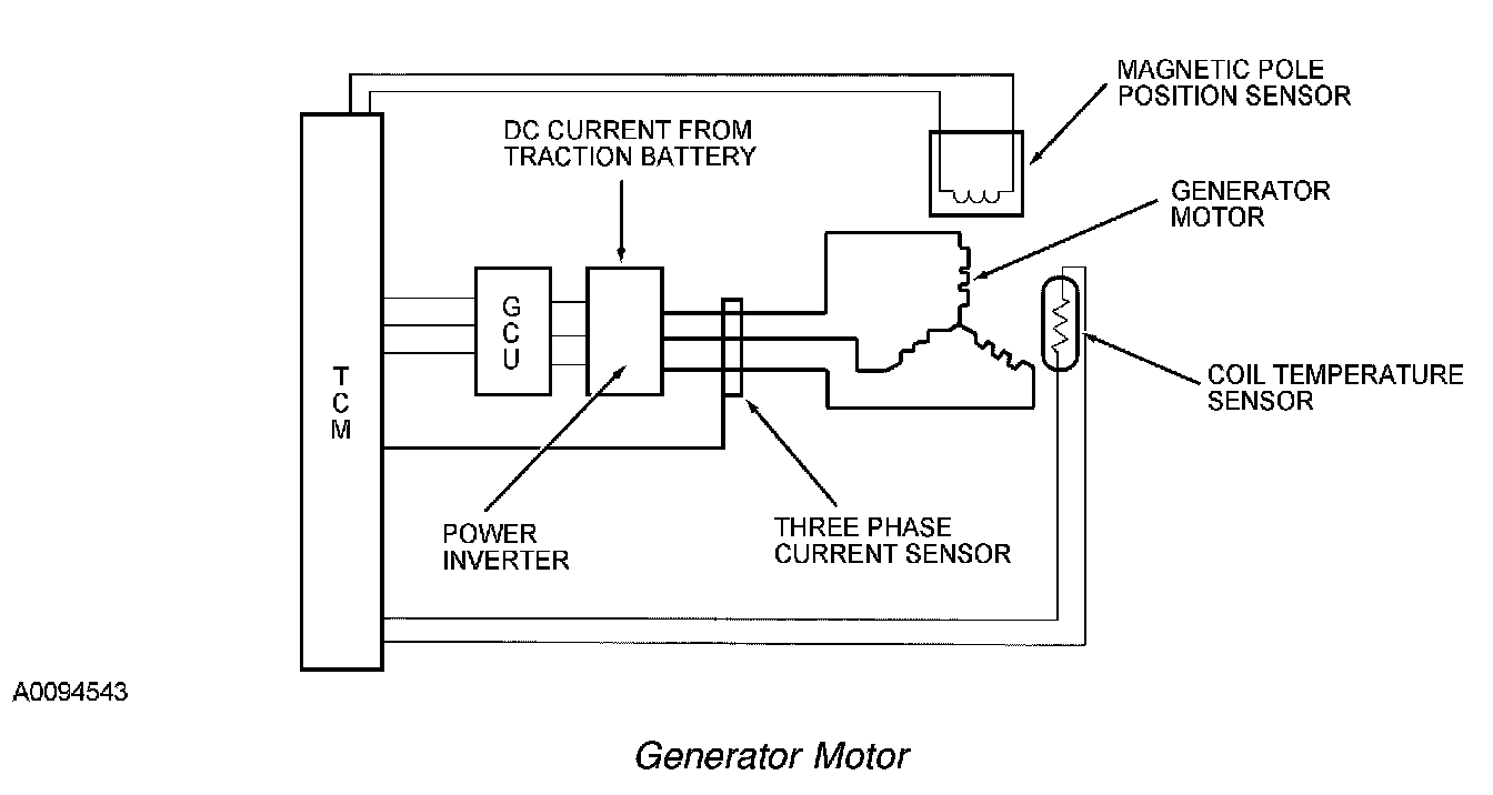 The generator motor is a three-phase permanent magnet AC motor connected to the sun gear of the planetary gear set. The generator power inverter (internal to the transaxle) receives a DC current from the high voltage traction battery. The DC current is inverted to an AC current, which is controlled by the TCM and the generator control unit (GCU). Depending on the mode of operation, the generator motor can rotate in the same (clockwise) or reverse (counter clockwise) direction as the internal combustion engine. The TCM also monitors generator position, speed, phase current, power inverter temperature, coil temperature, and voltage. It processes a variety of PCM and battery energy control module (BECM) inputs to determine generator function. The inputs are divided into two categories: the hardwired signals and the network messages. The inputs used to determine generator function include the total torque desired, the engine speed desired, the generator mode, the generator shutdown, and the vehicle mode. The generator operates in one of the following generator modes: torque, speed, engine cold start, engine normal start, engine high speed start, and engine enhanced speed control stop. The generator is used as a starter for the internal combustion engine, charges the high voltage traction battery, and controls the engine speed. The TCM reports the generator error status to the PCM. The PCM initiates an appropriate limited operating strategy (LOS) mode and sets the diagnostic trouble code (DTC) P1A0D, Hybrid Powertrain Control Module - Generator Disabled, based on the error status it received. The TCM also sets a DTC which indicates the cause of the generator motor concern.
