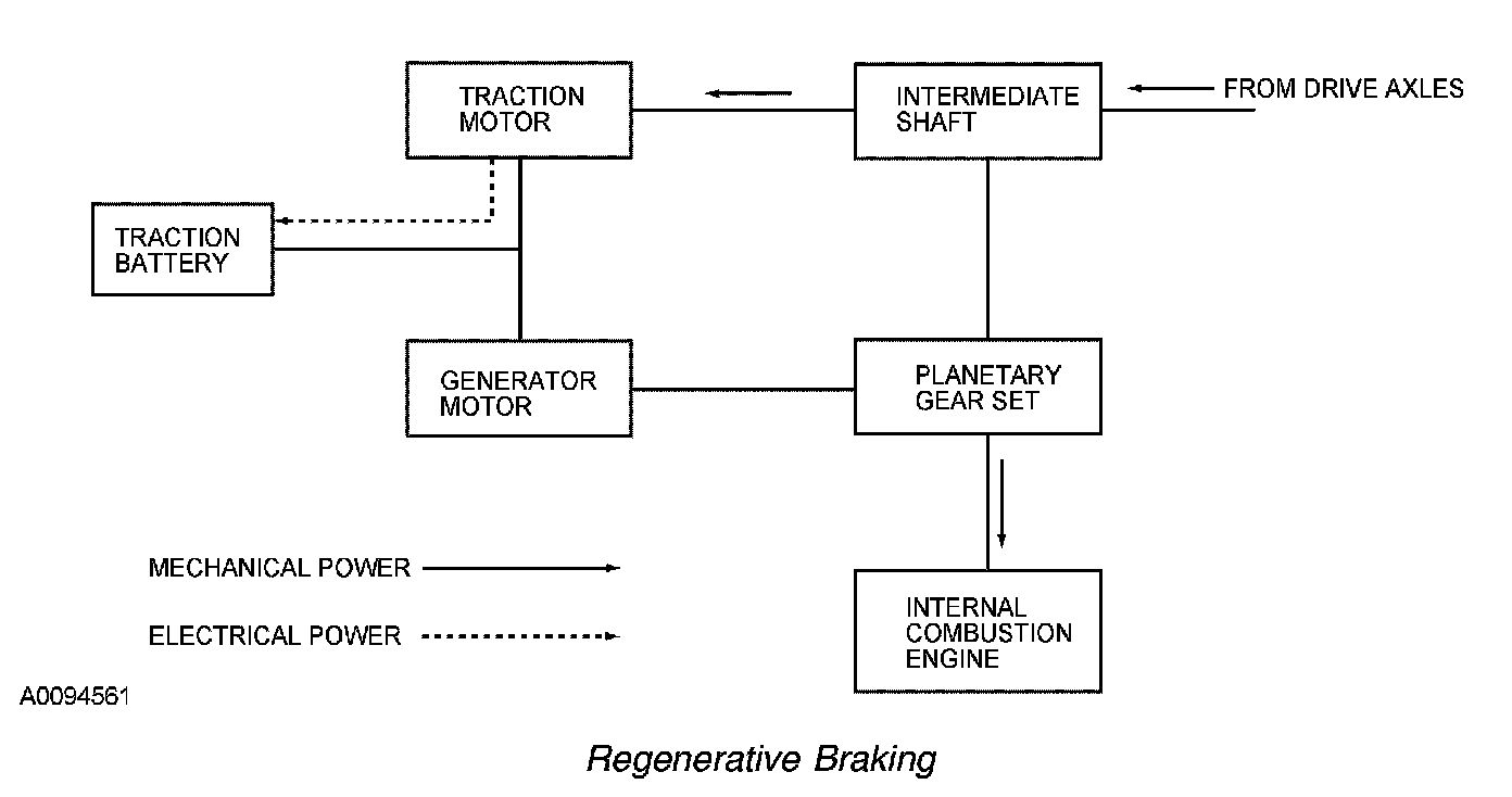 The regenerative braking is a software strategy and is controlled by the PCM, TCM, and BECM. Regenerative braking is the ability to capture and store a portion of the energy that would be lost as heat during a braking event. When the driver applies the brakes, the PCM determines how much negative torque (braking force) the traction motor should provide in addition to the friction brakes. Depending on the high voltage traction battery state of charge, the amount of negative torque provided by traction motor can vary between 0 and 100 percent. The traction motor then becomes a generator, which causes the energy to flow into the high voltage traction battery. The PCM strategy smoothly blends regenerative and friction brake effort to make the dual brake operation transparent to the driver.