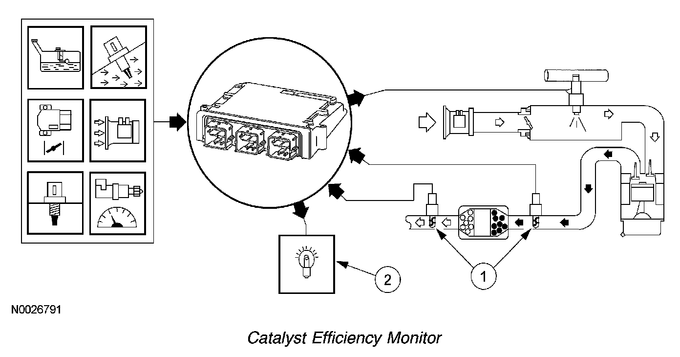 CATALYST EFFICIENCY MONITORThe catalyst efficiency monitor uses the rear heated oxygen sensor (HO2S), after the catalyst, to infer the hydrocarbon (HC) efficiency based on the oxygen storage capacity of the catalyst. During monitor operation the powertrain control module (PCM) calculates the length of the signal while the sensor is switching. Under normal closed-loop fuel conditions, high efficiency catalysts have significant oxygen storage. This makes the switching frequency of the rear HO2S very slow and reduces the amplitude, which provides for a shorter signal length. As the catalyst efficiency deteriorates due to thermal and chemical deterioration, its ability to store oxygen declines. The rear HO2S signal begins to switch more rapidly with increasing amplitude and signal length. The predominant failure mode for high mileage catalysts is chemical deterioration (phosphorus deposits on the front brick of the catalyst), not thermal deterioration.