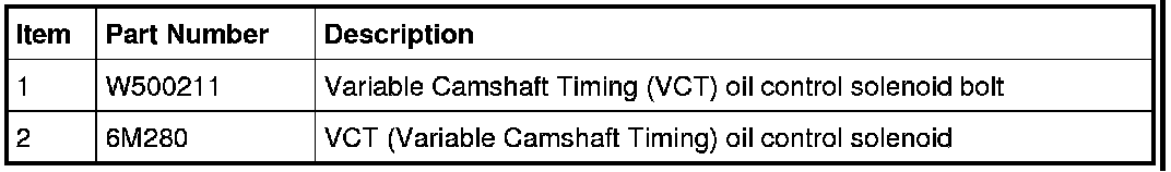 2. Remove the bolt and the Variable Camshaft Timing (VCT) oil control solenoid.
