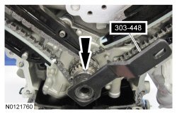 19. Depress the LH secondary timing chain tensioner and turn the tensioner 90 degrees.