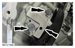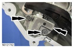 17. Remove the 3 LH intake Variable Camshaft Timing (VCT) assembly bolts and the 3 LH exhaust VCT (Variable Camshaft Timing) assembly bolts.