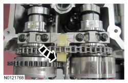 9. Slide the RH VCT (Variable Camshaft Timing) assemblies and secondary timing chain forward 2 mm (0.078 in).