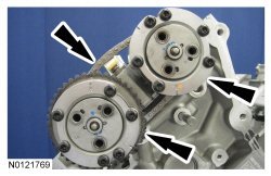 8. Remove the 3 RH intake Variable Camshaft Timing (VCT) assembly bolts and the 3 RH exhaust VCT (Variable Camshaft Timing) assembly bolts.