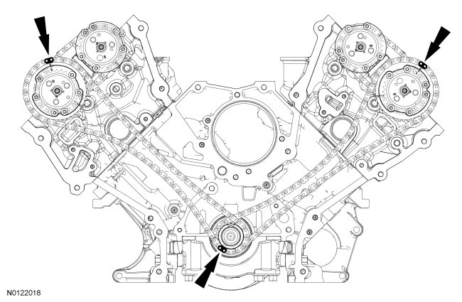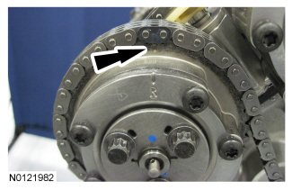Align the colored link on the timing chain with the timing mark on the LH VCT assembly.