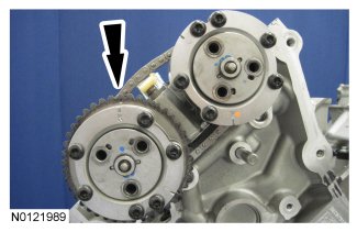 The timing mark on the exhaust VCT assembly should be in the 1 o'clock position.
