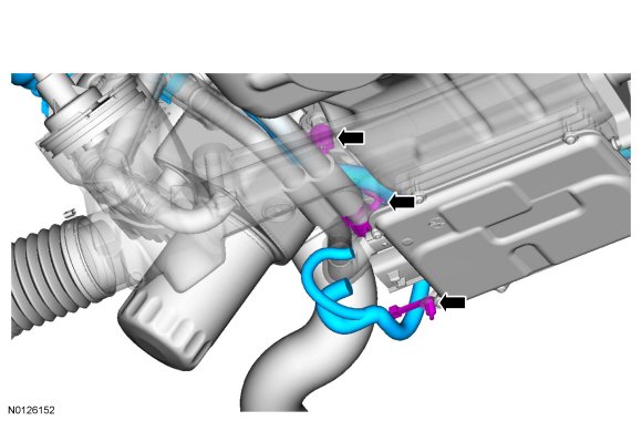 24. Detach the battery cable harness locator from the EPAS (Electronic Power Assist Steering). If equipped with an oil cooler, detach the battery cable harness locators from the oil pan stud and the inner oil cooler tube.