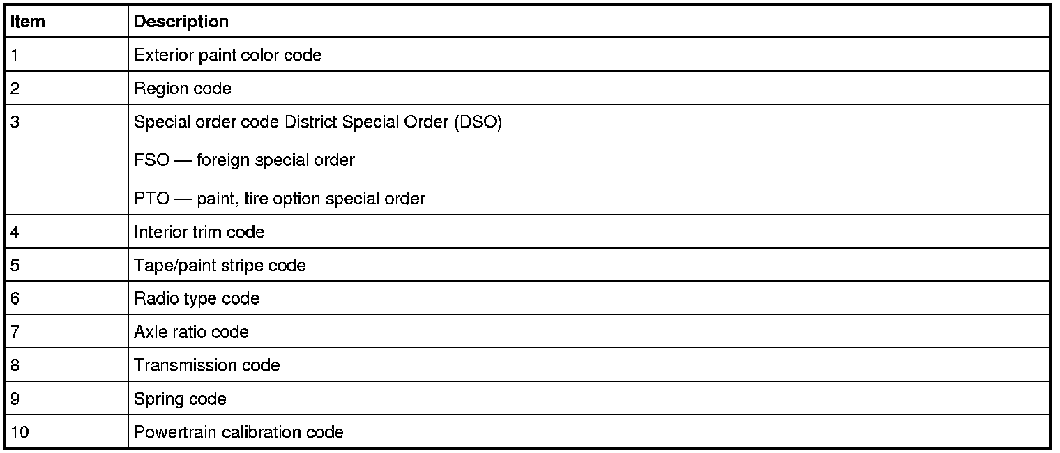 Powertrain calibration information is printed in the lower right corner of the VC (Vehicle Certification) label. Only the base calibration information is printed. Revision levels will not appear, however, this information can be obtained through a scan tool using the most current software revision.