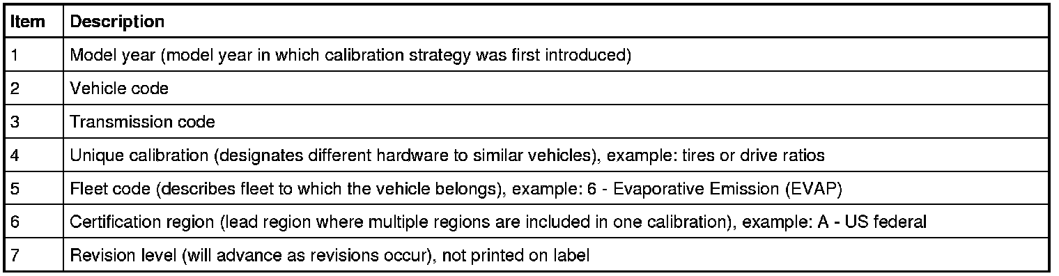 NOTE: Powertrain calibration information is limited to a maximum of 5 characters per line on the VC (Vehicle Certification) label. Because of this, calibration identification consisting of more than 5 characters will wrap to the second line on the VC (Vehicle Certification) label.