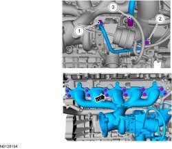 2. Remove the two engine oil pipe fasteners from the turbocharger and remove the pipe.