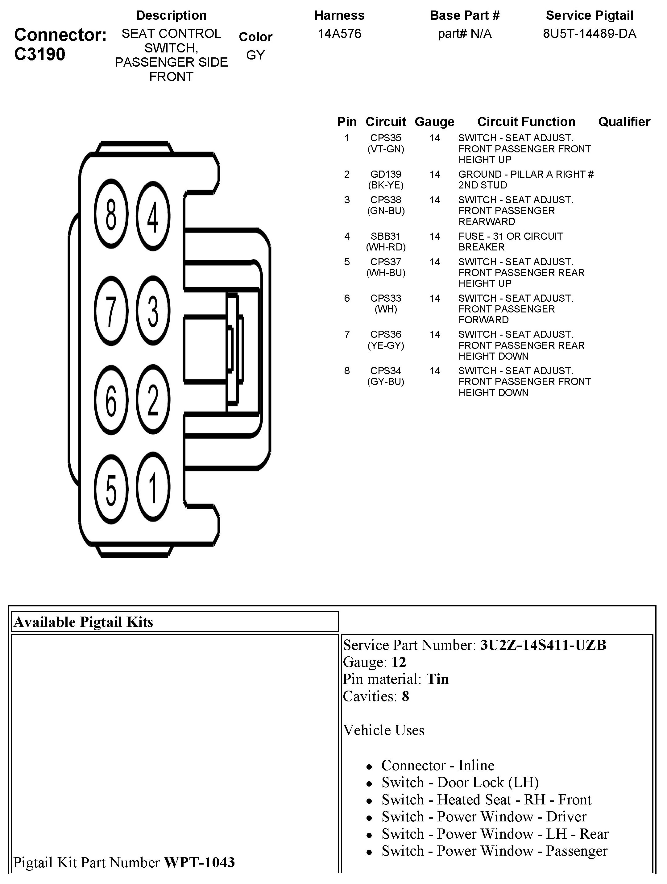 C3190 Seat Control Switch, Passenger Side Front
